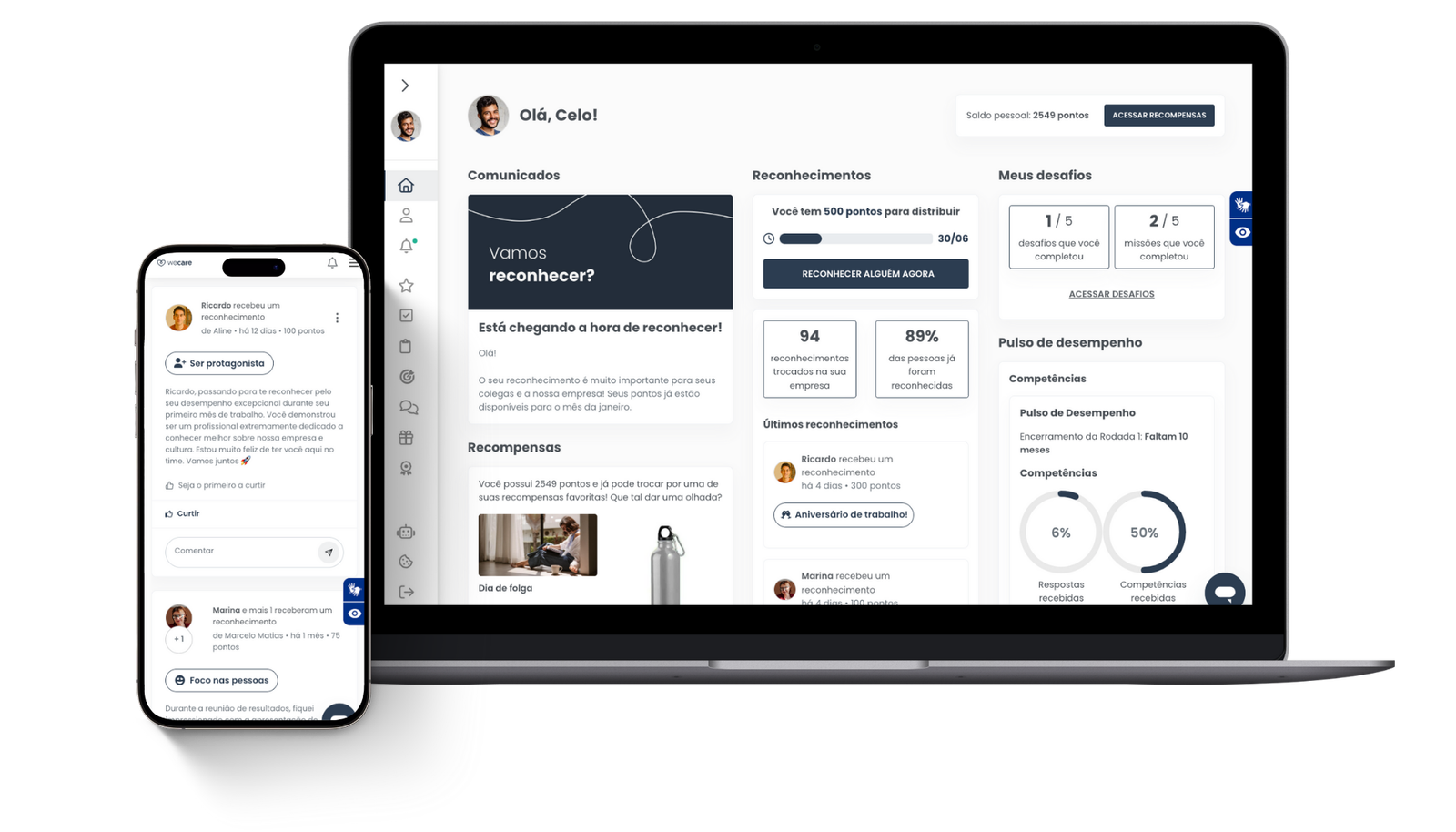 Você faz o setup da plataforma com apoio da WeCare parametrizando valores, competências e metas. Se necessário, é possível a realização de mentorias para estruturação de processos.