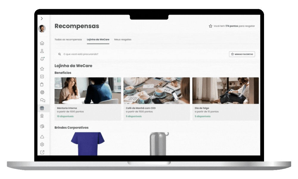 Com o sistema de pontos e gamificação da WeCare, os colaboradores mais engajados trocam suas conquistas por brindes exclusivos no catálogo interno. Você controla tudo de forma prática e transparente.